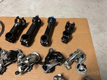 Vendo intero lotto oppure a singoli pezzi vari componenti / ricambi bici da corsa e MTB. Se interessati chiedetemi qualsiasi cosa. PREZZI BASSI! Se presi in blocco faccio un gran bel prezzo!!! Di seguito quello che ricordo: -Guarnitura Campagnolo (con relative viti di serraggio) -Pedali da corsa in carbonio -Cassetta vintage 5v -Cassetta Shimano NUOVA 10v (con scatola) -Lucchetti vari -Leve freno -Dischi freno TEKTRO rossi -Varie pipe manubrio (anche quelle regolabili) -Vari attacchi manubrio (Bontrager,ITM,ecc..) -Cambio Shimano Revoshift 6v -Cambi Shimano Deore XT 3x9 -Selle (Ergonomica,Velo,Selle Royal) -Borraccia vintage BIANCHI .Borsello vintage marrone in camoscio -Pinze freno vintage eroica -Vari cavalletti metallo -Deragliatori anteriori Shimano a 2 o 3 velocità. Uno è Shimano "a saldare" quindi senza collarino NUOVO. -Deragliatori posteriori, Shimano vintage, Shimano 105 10v, Campagnolo Veloce 8v -Pedali Neri flat MTB Non spedisco!!!