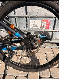 la bici ha freno a disco davanti e dietro, cambio a leva B-TWIN MEGA RATIO 9 marce, ammortizatore regolabile anteriore.