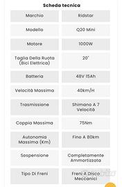 NO PERDITEMPO. NO PERDITEMPO. NO PERDITEMPO. NO PERDITEMPO. Bicicletta elettrica ridstar q20 pro mini autonomia 80km in totale elettrico (di più se usata in modalità ausiliare) Anche piu se usata con le prime 3 velocità 5 velocità Velocita massima Indicata sul display della bici 50.1 km/h (la scheda tecnica riporta 40km/h) Acquistata a giugno 2024 (certificato di acquisto ecc ecc) circa 3000 km Prezzo LEGGERMENTE trattabile. Scatola inclusa. La bici è dotata di acceleratore ma i fili li ho scollegati per motivi di legge La bici non è a pedalata assistita ma è elettrica (accelleratore) o pedali ma in modalità ausiliaria ovvero che muovi i pedali solo per far andare il motore senza il minimo sforzo fisico