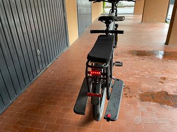 Pedalata assistita fino a 45 km/h, doppia batteria (500+500), cambio elettronico Rohloff a 14 marce integrato nel mozzo, trasmissione a cinghia, luci e clacson, kit passeggero, kit pedane, kit borse laterali. Portata complessiva fino a 170 kg, portata portapacchi posteriore fino a 65 kg, portata portapacchi anteriore fino a 5 kg. Taglia 51, per persone da 170 a 185 cm. Poche centinaia di km percorsi, sempre garage, neanche un graffio, pari al nuovo. Provate a configurare con queste specifiche la bici sul sito riese & muller e vedrete qualcosa oltre 8000 € .