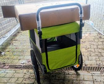 Papilio Shop modello ZETA taglia Large, colore verde Il carrello è stato acquistato nuovo e utilizzato una sola volta esclusivamente in giardino per prova; è quindi in condizioni impeccabili, pari al nuovo Dimensioni generose: Ampio spazio interno (circa 50x85 cm), ideale per cani di taglia media e grande. Convertibile: Può essere utilizzato sia come rimorchio da agganciare alla bici che come passeggino per cani (kit incluso), utile per entrare in locali o zone affollate. Sicurezza e Comfort: Struttura robusta con protezioni laterali, zanzariere per la ventilazione e copertura antipioggia frontale. Praticità: Si monta e smonta rapidamente; le ruote sono dotate di sgancio rapido per riporlo facilmente in auto o in garage. Condizioni: Usato una sola volta in giardino. Nessun segno di usura, pulito e completo di tutti gli accessori originali (attacco bici, bandierina, ecc.). Mai usato per bicicletta ma solo prova passeggino cane prezzo trattabile