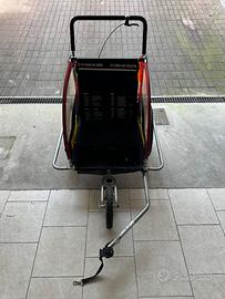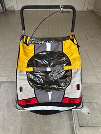 Vendo Rimorchio carrellino porta bimbo. Adatto per due posti. Completo di cinghie di sicurezza, tendina protettiva rimovibile, ruota anteriore rimovibile (diventa un carrellino a spinta), leva freno. Completamente smontabile e richiudibile