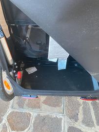 Rimorchio in grado di portare due bimbi con cinture di sicurezza. In condizioni perfette, ha circa tre anni ma è stato usato pochissimo. Nelle foto non ho messo gli accessori come: ruota anteriore e maniglione per trasporto a mano tipo passeggino, perno in acciaio per mozzo ruota posteriore; non sono nelle foto ma ci sono. Da notare due particolari fondamentali: la zanzariera/parasassi e l'antipioggia integrati, spazio portabagagli. Ho ancora l'imballo/scatolone originale. Volendo spedisco ma meglio ritiro a mano a Rimini