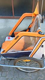 Rimorchio porta-bimbo biammortizzato per bicicletta, colore arancione. Alto 115 largo comprese ruote 100 lunghezza 120. Qualche gancio è un po' arrugginito, l'asta della bandierina e le gomme sono da sostituire. Si collega alla bicicletta oppure si può usare staccato per jogging. 2 posti. Usato (poco).