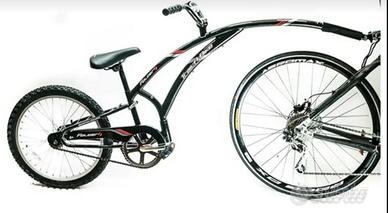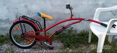 Rimorchio con pedali per bambini dai 4 ai 9 anni circa. Sì collega al canotto della sella della bicicletta dell'adulto e il bambino può pedalare e lo aiuta ad imparare ad andare in bicicletta (vedi ultima immagine presa dal sito) Perfettamente funzionante. Presenta righe nella struttura (è usato)