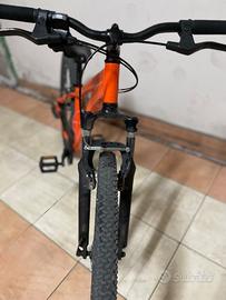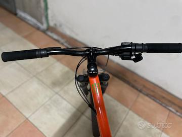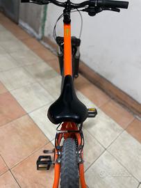 ruote 26 pollici, telaio in alluminio, inclinazione pronunciata adatta per i bambini, trasmissione monocorona, da 34 denti e 7 velocità, un solo comando cambio, sul manubrio, cambiare velocità è un gioco, frena efficacemente grazie ai 2 freni a pattino V-Brake.