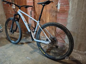 rockrider am 100ht tg L di 2 anni con cambio deore 11v, cassetta 11-51, corona 30 denti, reggisella telescopico, forcella rockshox judy 130mm, manubrio largo, attacco manubrio corto da 35mm e diversi upgrade fra cui, copertone maxxis DHF 2.3" latticizzato, e copertone maxxis DFR al posteriore. volendo posso montare una forcella migliore, rockshox 35 da 140mm o freni Shimano 420 a 4 pistoni oppure xt a 2 pistoni.