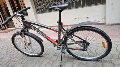 Bicicletta, se trova. Lotto Milano faccio io consegna zona Milano non faccio spedizioni Telaio: In acciaio resistente con geometria Slopping, progettato per la massima manovrabilità. Ruote: Diametro 24 pollici. Pneumatici con tecnologia Skinwall per una maggiore leggerezza. Ammortizzazione: Forcella anteriore a molla (escursione circa 40-50 mm) per assorbire le asperità del terreno. Trasmissione: Cambio a 18 velocità (3 corone anteriori, 6 pignoni posteriori). Comandi del cambio a manopola rotante (shifters) sul manubrio. Freni: Freni a pattino tipo V-Brake (facili da mantenere ed efficaci per questo peso).