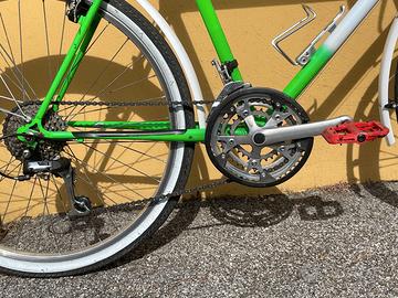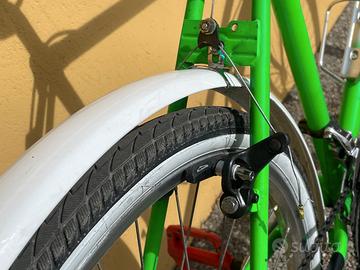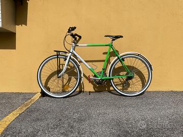 Vendesi bicicletta Rollmar, ideale per il commuting urbano o per gite fuori porta, appena revisionata completamente da cima a fondo. La bici è meccanicamente perfetta, non richiede alcun investimento aggiuntivo: sali e pedali. Punti di forza: - Meccanica Perfetta: La trasmissione è un affidabilissimo gruppo Shimano Exage Trail (cambio indicizzato/friction), noto per la sua estrema robustezza e quasi assenza di manutenzione. Appena revisionato. - Componenti Nuovi: Appena installati copertoni (spalla bianca ant./post.), catena e tutti i pattini freno. - Postura comoda e rialzata da city bike. Già dotata di portapacchi anteriore e parafanghi completi inclusi. - Massima Versatilità: Il telaio è in acciaio, quindi super resistente. È dotato di tutti i supporti possibili per montare portapacchi posteriore, lucchetto da telaio e luci. - Finitura bicolore bianco/verde con pedali flat rossi e gomme whitewall che le donano un carattere unico. Misura: M (adatta per stature da 1,65m a 1,80m). Manubrio regolabile in altezza. Condizioni: Meccanicamente impeccabile. Qualche segno estetico sulla vernice che non compromette assolutamente la struttura. È la classica sleeper urbana: un'estetica che non dà nell'occhio o non fa gola, ma con una meccanica impeccabile e componenti nuovi di pacca. Vai ovunque, la leghi dove capita e dormi sonni tranquilli. Bici visionabile preferibilmente a Ballabio ma possiamo accordarci per trovarci a Lecco o limitrofi.