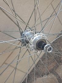 Ruota 28 pollici posteriore completa, il cerchione è nuovo, comprato da ciclista, con camera d'aria e pneumatico 700x35c, filettatura adatta a carro da 11 cm come da foto 30 euro consegna a mano.