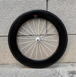 Vendo ruota nuova in carbonio alto profilo per copertone e freni a pattino, altezza cerchio 90 mm, larghezza esterna 22 mm, sgangio rapido in Titanio, nipple Ergal, peso 948 grammi.