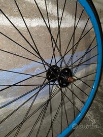 Ruota anteriore per bici urbana o fixed, cerchio blu a profilo alto, raggi e mozzo neri.