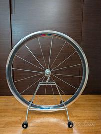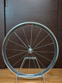 Vendo iconica ruota anteriore Campagnolo Shamal in alluminio, profilo alto aerodinamico, risalente a metà anni '90 (grafiche blu).
