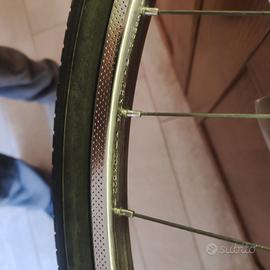 Ruota anteriore completa, cerchi vintage in acciaio cromato Imperial 28 x 1-1/4 20x622 36 fori, mozzo Normandy 36H, sgancio rapido Tacx, camera d'aria e copertoncino Schwalbe 700x35C (copertoncino alla frutta). Eventuale disponibilità anche della posteriore (stesso cerchio).