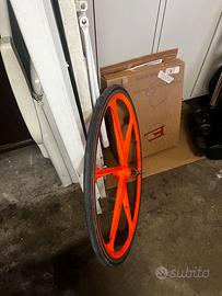 Vendo ruota anteriore RIDEWILL BIKE a 6 razze in lega, profilo 30 mm, colore arancione. Ideale per bici a scatto fisso. Inclusi copertone e camera d’aria.