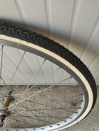 ruota con cerchione anteriore per bicicletta da donna con copertone nuovo come da foto misura 26 pollici. valuto scambio.