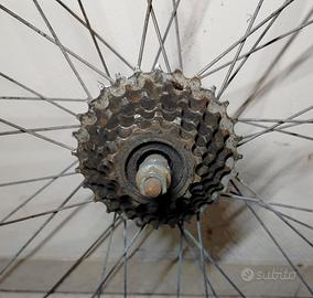 vendo ruota per bicicletta tipo mountain bike cerchione da 26 pollici con sei corone completa di bulloni, camera d'aria e copertone nuovo, nessun raggio rotto non spedisco visione e ritiro diretto a Pesaro citta'