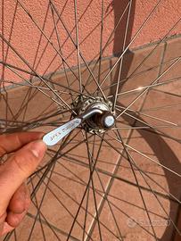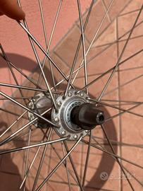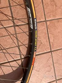 Vendo ruota anteriore per bici da corsa vintage campagnolo omega con mozzo shimano 600,completa di perno e copertone Vittoria da 20mm e camera d’aria installati.