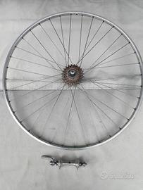Ruota posteriore in alluminio Ambrosio con pacco pignoni Regina Extra Oro ,mozzo Record Campagnolo e sgancio rapido Campagnolo. Tutto in ottime condizioni.