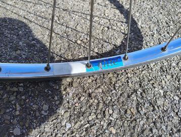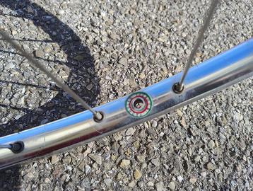 Ruota posteriore bici corsa misura 700c in alluminio marca Ambrosio modello Elite. Pacco 6 pignoni Regina 14-24, chiusura Miche. Ideale per restauro bici d'epoca/eroica. Qualche graffio sulla pista frenante, ma buone condizioni generali, la ruota è dritta e il mozzo è perfetto.
