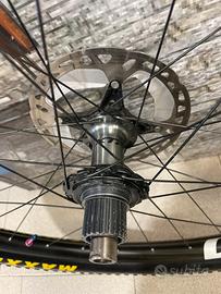 Ruote 29’ Damil in carbonio, corpetto Shimano Hyperglide+ / micro spline con mozzo XTR, copertone Maxxis RaconRace e disco Shimano 180, disponibile già con Kit Tubless.