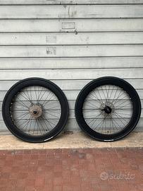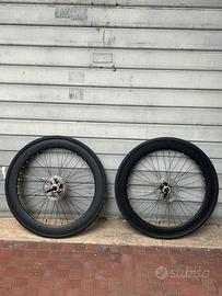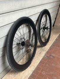 Vendo ruote aero per bici da corsa ,triathlon o cronometro ad alto profilo da 55 in alluminio. Ruote per copertoncino. Le ruote vengono vendute con dischi a 6 bulloni e sganci rapidi/quick release. (Non sono pensate per perno passante) Pacco pignoni non incluso. Copertoni su richiesta. I cerchi sono in alluminio e hanno un certo peso-non ho gli strumenti per dirvi il peso con esattezza. Le ruote sono nuove. Ritiro a mano a Roma.