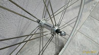 Ruota anteriore in alluminio, Shimano "Vuelta Chrome Lite", da 28', profilo medio, raggi lenticolari, in buone condizioni. Regalo ruota posteriore, stesse caratteristiche dell'anteriore, con corpetto Shimano 10 vel., due raggi mancanti ed alcuni di diversa fattura. Consegna a mano, no spedizione.