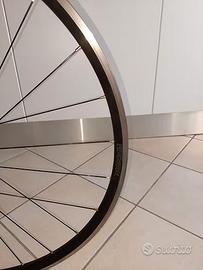 Cerchi in alluminio con larghezza esterna di 26 mm e larghezza interna di 19.5 mm, mozzo compatibile con Shimano 10/11 rapporti, frenatura rim brake.