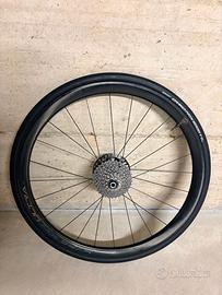 Campagnolo Hyper Ultra 2wayfit (tubeless e copertoncino), cerchio in carbonio H.U.L.C da 37 mm e canale interno da 21mm, ottimizzate per ruota da 28mm.