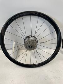 Ruote in carbonio molto leggere, acquistate ad Aprile 2025 e utilizzate nella stagione estiva. Molto reattive e manwggevoli, cuscinetti CULT e corpetto N3W, canale interno da 21 mm e lrofilo da 37 mm. Peso 1.250 g.