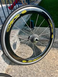 Rarissime e pari al nuovo. Ruote originali MAVIC Cosmic Carbon Quick Release scancio rapido 26" pollici (571 mm ETRTO 23-571) tubular. Profilo 50 mm, 16 raggi. Mozzi Mavic SSC. Bloccaggi rapidi con leve a camme originali MAVIC. Peso: anteriore 873 g; posteriore 1.088 g. Pista frenante in alluminio (utilizzo di pattini freno tradizionali). Cassetta Shimano 8v (16-17-18-19-20-22-24-26) e tubolari Continental Sprinter 22 mm Safety System. Prezzo 700 euro. Preferisco ritiro a mano. non permuto con ZIPP, ROVAL, VISION, PRINCETON CARBONWORKS, HOLLOWGRAM, CORIMA, MICHE, DT SWISS, AMBROSIO, HED, MAVIC, ELITE, ICAN, ...