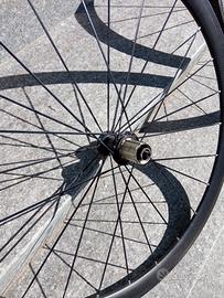in vendita coppia di ruote in carbonio per freni a pattini, altezza profilo 38 mm, larghezza cerchio 23 mm, per tubolari