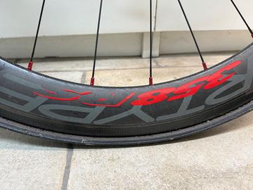 Ruote Miche Supertype 358 in carbonio per tubolari, altezza differenziata (35mm davanti, 58 mm dietro). Vendute senza tubolari e con borse portaruote originali.