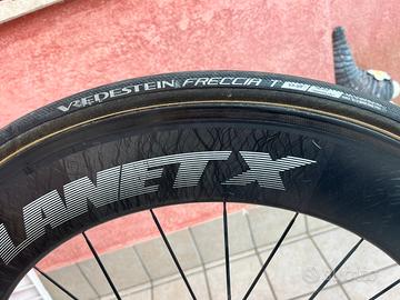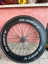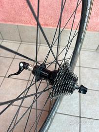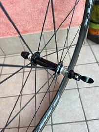 Ruote freni rim in carbonio con profilo anteriore 50 e posteriore 80 , poco usate senza un graffio super leggere e scorrevoli . Piste frenanti ottime nessun difetto. Per freni rim brake. Montano tubolari da 23 ma adatta anche a 25 o piu’. Corpetto shimano 11v adesso monta 10v con spessore