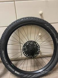 vendo ruote complete usate per circa 50km e poi smontate da bici nuova per cambio tipologia,erano montate su Olympia ex900 sport ,sono cerchi gipiemme in alluminio 29 anteriore e 27,5 posteriore mullet,complete di pacco pignoni 12v sram sx e compertoni con camera d’aria e dischi ,volendo a parte posso fornire pure il cambio e manettino sram sx.
