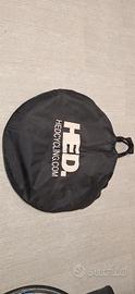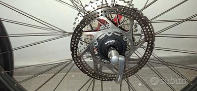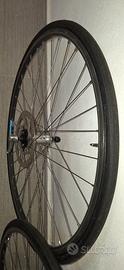 vendo ruote praticamente nuove che sono state fatte per adattare una mtb da 26 a circolare per strada. mozzi,dischi e copertoni nuovi,cassetta 11 rapporti. complete di borse.