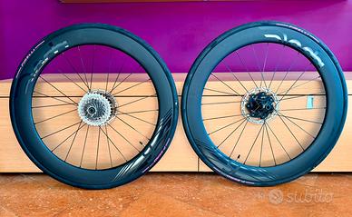 Ruote corsa strada deda sl 6 per freni a disco. Usate per circa 1.000 km.Ruote in carbonio ad alto profilo 62mm con sezione maggiorata 26 mm a 24 raggi. Cerchio costruito per tecnologia tubeless e copertoncino. Mozzi in titanio con cuscinetti ceramici. Finitura pob total black. Copertoncini seminuovi p zero race viola da 28. Con o senza sacca
