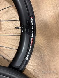 Nuove ruote DT Swiss Erc 1100 dicut 45 già montate con Vittoria 32mm tubeless. Con i cuscinetti SINC ceramic e ruota libera Ratchet exp a 36 denti . Dentro il kit dalla mia nuova bici, io ho tenuto Campagnolo, e vendo le DT nuove.