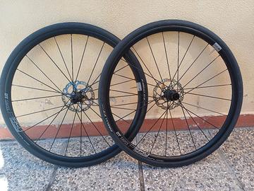 Ruote DT Swiss P1850, usate pochissimo come seconde ruote per gravel, forse 500km solo strada, complete di dischi shimano da 160, copertoni Pirelli P7 da 32 e camere d'aria, vendo euro 220.