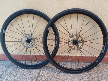 Ruote DT Swiss P1850, usate pochissimo come seconde ruote per gravel, forse 500km solo strada, complete di dischi shimano da 160, copertoni Pirelli P7 da 32 e camere d'aria, vendo euro 220.