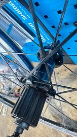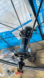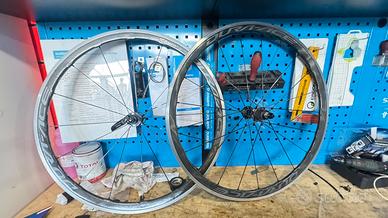 Vendo ruote in carbonio con pista frenante in allumunio, piccoli segni di usura, ma le ruote a livello di mozzi e pista frenante sono ottime