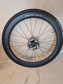 Ruote Shimano Dura Ace C50 pari al nuovo appena revisionate, volendo anche con Dischi freni Shimano 160 anteriore nuovo e 140 posteriore al 50% Tubeless Continental da 30 posteriore e 28 (nuovo)anteriore Cassetta pignoni originale Dura Ace in ottime condizioni 11/30 Il prezzo è relativo ai soli cerchi senza Tubeless Cassetta e Dischi freni