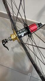 Cerchi e raggi in alluminio, mozzo in carbonio, sgancio rapidi in titanio.