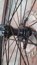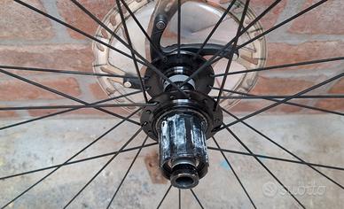 ruote in ottime condizioni, hanno gli adesivi un po rovinati in alcuni punti, ma la struttura del cerchio è ottima senza difetti. ruote ideali per gravel o bdc, le vendo complete di dischi ultegra/xt in buone condizioni. corpetto HG.