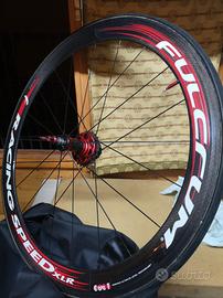Ruote Fulcrum Speed XLR 50 per tubolari e freni a pattino. Ruote senza tubolari e pacco pignoni già pulite per montaggio nuove coperture, cuscinetti Cult ceramici. Qualche difetto negli adesivi, ma includo set di adesivi nuovi. Sganci rapidi compresi.