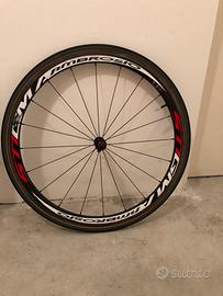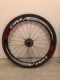 Ruote in carbonio Ambrosio Stigma . Profilo ruota Anteriore 38mm,profilo ruota Posteriore 50mm. Entrambe con tubolare Vittoria Corsa 25mm. Pacco pignoni Shimano 10v .