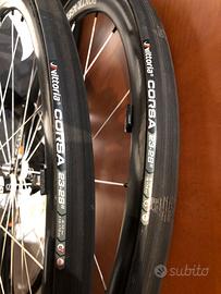 Coppia cerchi bici da corsa In carbonio Bontrager Aeolus 3 con l’equilibratura. Comprensivi sacchi copriruota originali . Con tubolari nuovi Vittoria corsa 23-28 montati, calamita conta pedalate, con cassetta seminuova SRAM XG1090 di 10 velocità 11/28 .