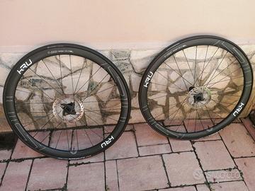 Ruote Kru disco Carbonio profilo 38 mm 200000km garanzia cuscinetti . Compreso pacco pignone shimano 11 -32. Usate pochissimo cambio x passaggio altro modello ruote tenute molto bene.