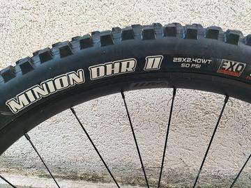 Coppia ruote pari al nuovo (3 uscite), diametro 29, raggi a testa dritta sfinati (28), corpetto Shimano microspline 12V , attacco disco center lock. complete di gomme maxxis come da foto, al posteriore inserto tannus tubeless.