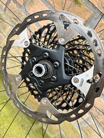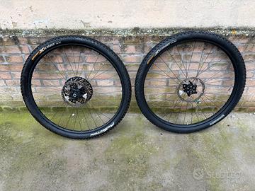 Vendo coppia di ruote mtb 29 NON BOOST leggerissime 32 raggi in alluminio mozzi FRM anteriore Venus posteriore Meteor comprese di dischi shimano da 180 mm come si vede nella foto il cerchio posteriore e' da sostituire .. consegna a mano